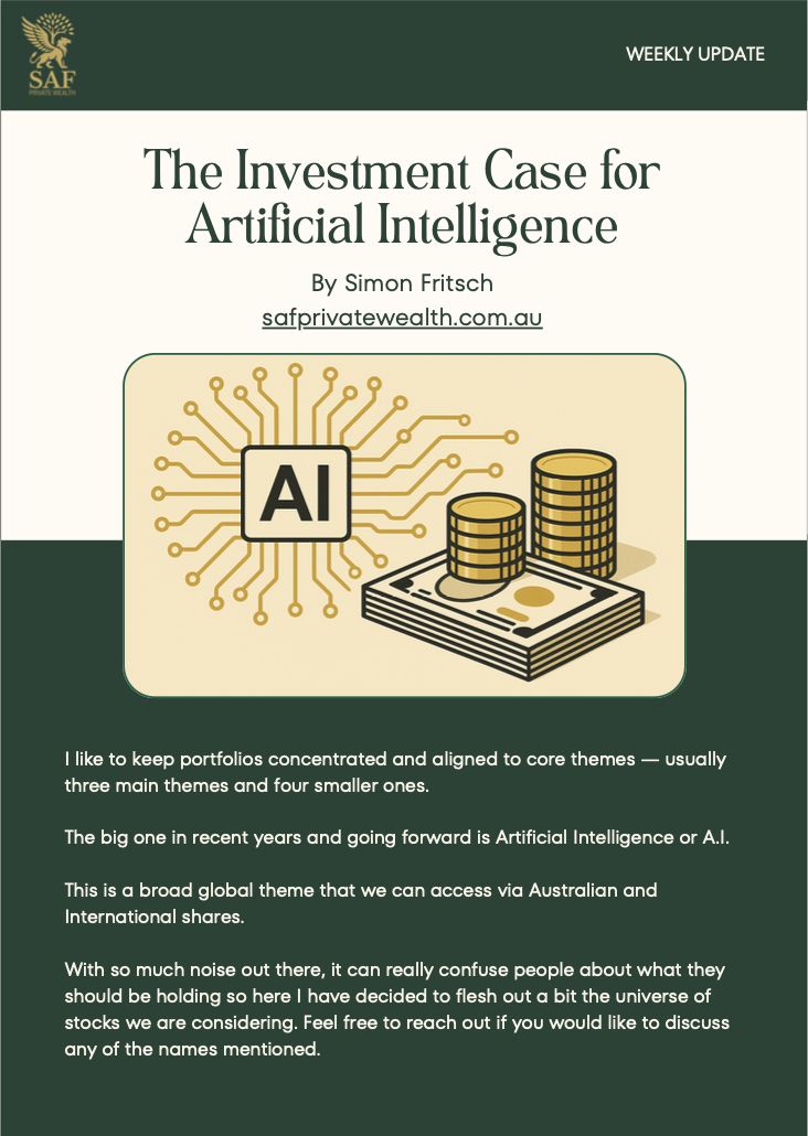 The Investment Case for Artificial Intelligence 8 July Written By Simon Fritsch “The global AI market is growing at an extraordinary pace. If you are not long you are wrong. Literally….” Looking for investment ideas and understanding of Artificial Intelligence stocks? Tap to get the assessment of AI stocks in the SAF July 2025 newsletter.. Tap to Download this Newsletter Now Want to stay up-to-date with market opportunities? Sign up with your email address to receive the complimentary SAF newsletter. Subscribe Now. First Name Last Name Email Address Sign Up We respect your privacy. Thank you! Simon Fritsch